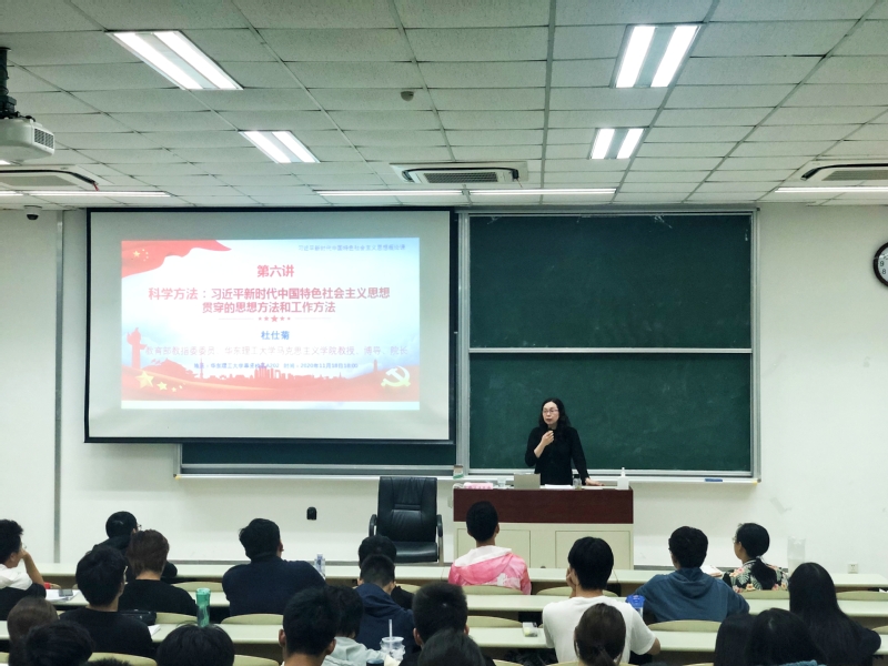 讲座最后,杜仕菊指出习近平总书记十分重视方法论问题,不仅重申了马克思主义的基本方法,而且提出了新的方法原则,丰富了马克思主义方法论宝库。她勉励在场学生学习习近平新时代中国特色社会主义思想,不仅要掌握其丰富的思想观点,而且要掌握贯穿于其中的思想方法和工作方法,学会用以指导自己的学习和生活。