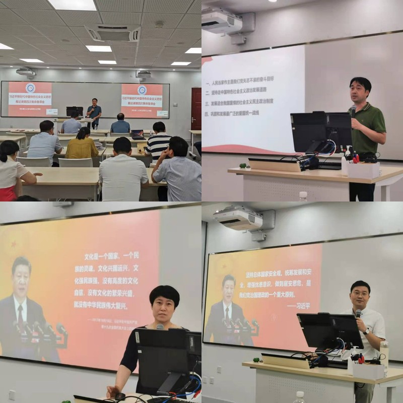 会上,我院教师方以启、卢杨、陈俊傲分别以“用更加健全的制度体系保证人民当家作主”“推动社会主义文化繁荣兴盛”“坚持总体国家安全观,走中国特色强军之路”为主题对第四讲、第五讲、第九讲的内容进行了示范说课。在研讨交流环节,教师们各抒己见,分享此次备课感悟,研讨讲授内容和教学方法,互相启发,在研究讨论中不断达成共识。