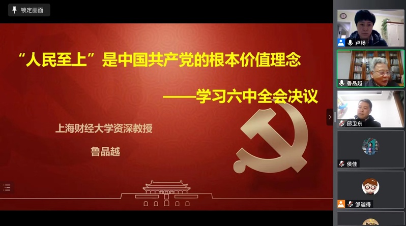 3月19日,全国经济哲学研究会副会长、上海财经大学资深教授、博士生导师鲁品越应邀以《“人民至上”是中国共产党的根本价值理念——学习六中全会决议》为题,为世界杯体育官方网站带来线上讲座。讲座由学院党委副书记兼纪委书记卢杨主持,学院100余名师生参加。