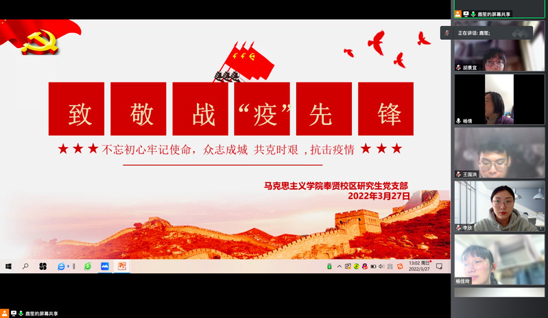 徐汇校区研究生党支部书记吕炫带领大家共同学习了抗疫精神,副书记马君可向与会党员分享了疫情期间的各类注意事项。奉贤校区研究生党支部书记方一惠带领大家回顾了我国自疫情发生以来涌现出的战疫英雄,号召大家为疫情防控贡献自己的力量。