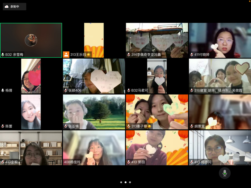 活动伊始,杨倩以一首《春天在哪里》开场,随后同学们以宿舍号为序依次接龙,一展歌喉。主题接歌环节中,同学们分别以人名、天气、根正苗红等不同主题的歌曲为大家带来了一场听觉盛宴,整个会场洋溢着愉快的笑声和欢乐的歌声。在你画我猜环节,各个宿舍纷纷“头脑风暴”,积极抢答,将比赛气氛带入高潮。最后,大家一起在屏幕前展示自己亲手制作的爱心折纸并合影留念,借此表达齐心战疫、共克时艰的决心和信心。