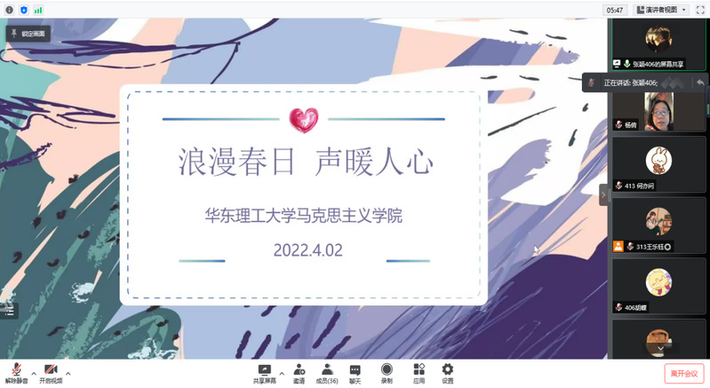 4月2日晚,以“浪漫春日 声暖人心”为主题的线上接歌比赛顺利举行。本次比赛以学生宿舍为单位进行,由学院研究生会文体部张颖主持,学院党委副书记杨倩、团委书记胡博成和各宿舍学生代表近40人参加。