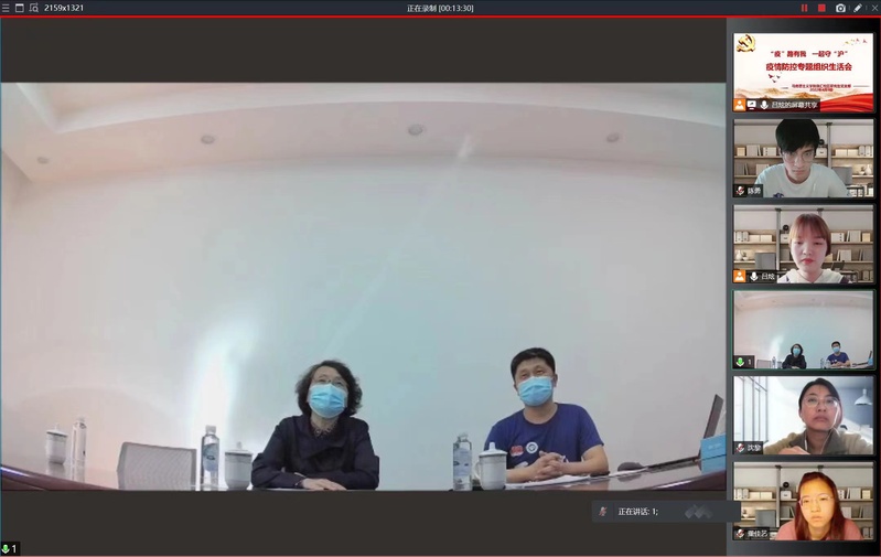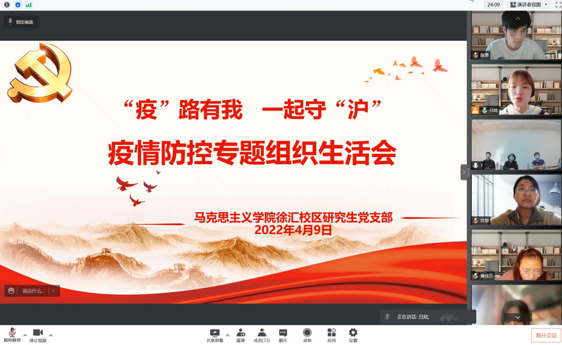 会上,大家一起学习了“孙春兰在沪调研指导疫情防控工作”和“中共上海市委致全市共产党员的公开信”等视频资料。汪斌锋作为联系支部学院领导介绍了当前疫情防控形势和相关文件精神。党员志愿者代表张万宇、蔡晓婷、马君可、沈黎分享了参与学校、街道疫情防控工作的经历和感悟。王爱祥介绍了学校的疫情防疫政策、措施和工作要求。