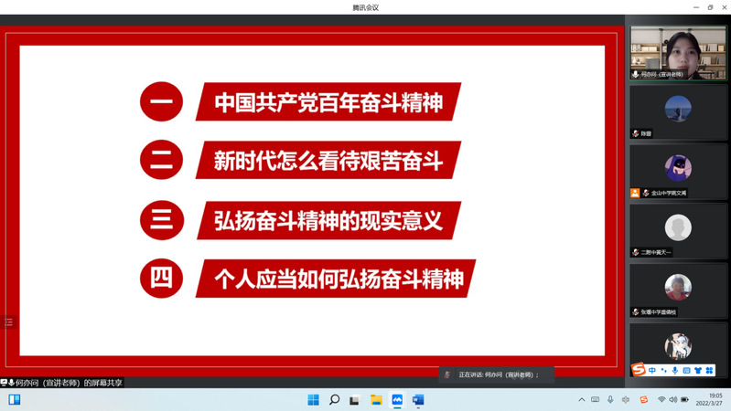 第二讲由学院研究生何亦问主讲,主题是《以奋斗为曲,谱青春之歌》。她从“中国共产党百年奋斗精神”“新时代怎么看待艰苦奋斗”“弘扬奋斗精神的现实意义”“个人应当如何弘扬奋斗精神”四个方面进行讲解,鼓励同学们在新的时代条件下继承和发扬艰苦奋斗的优良传统。