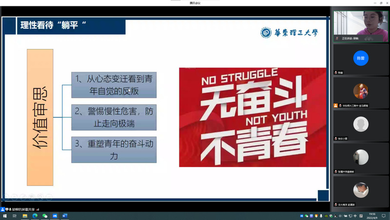 第五讲由学院研究生梁柳主讲,主题为《网络“躺平”现象与青年奋斗精神培育》。梁柳从当下青年人的“躺平”现象入手,在分类归纳中阐明了“躺平”的本质属性。她从历史和现实的两个维度分析了“躺平”现象的形成原因,鼓励同学们超越“躺平”,积极行动,通过培育奋斗精神不断激发前进动力。