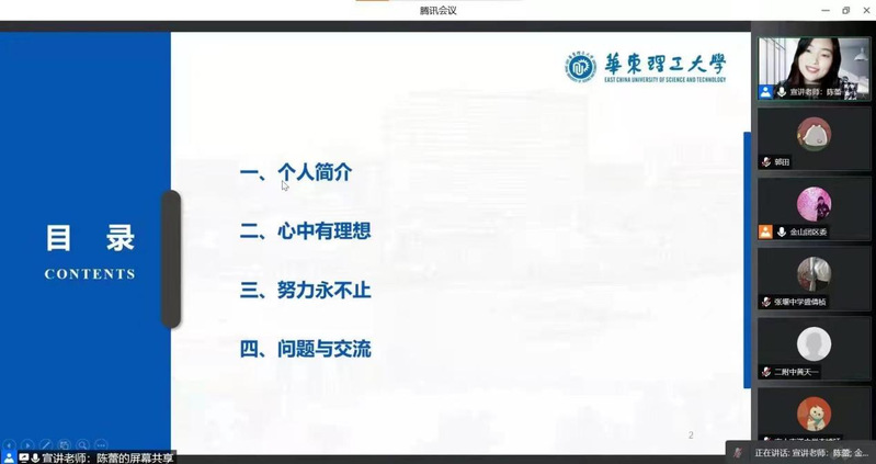 第一讲由学院研究生陈蕾主讲,主题为《心中有理想,努力永不止》。陈蕾从个人经历出发,介绍了她的理想信念和学业选择。陈蕾指出,每个人的理想虽然不相同,但都与中华民族伟大复兴的中国梦紧密相连。她鼓励同学们将个人的选择和努力与国家的前途命运紧密联系,勇担时代责任与使命。