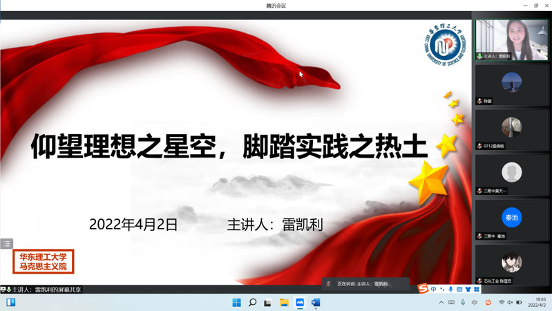 第三讲由学院研究生雷凯利主讲,主题为《仰望理想之星空,脚踏实践之热土》。她讲解了理想信念的基本内涵,并结合影片《觉醒年代》和《我们的法兰西岁月》说明树立和坚定理想信念的重要性。她还结合优秀的人物事迹阐释了理想信念的实现路径,鼓励同学们既要树立理想,也要勇于实践。