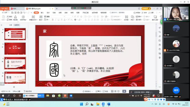 第四讲由学院研究生郭田主讲,主题为《砥砺家国情怀,担当时代重任》。郭田以“家”和“国”的概念为导入,从历史传统、时代发展和青年担当三个维度来讲解“家国情怀”。她认为家国情怀是中华民族精神的传承和延续,是一脉相承和与时俱进的,鼓励同学们胸怀家国情怀,为国家发展、社会进步积极贡献力量。