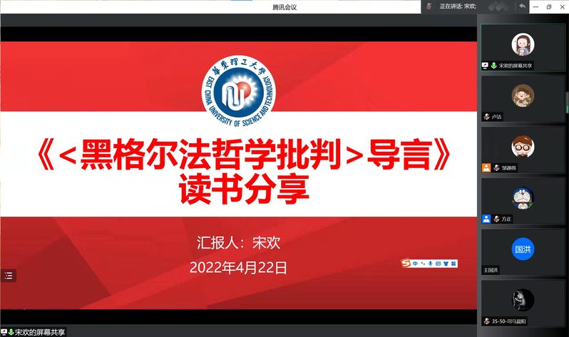 4月22日下午,世界杯体育官方网站第四期“云端品读 书香战疫”经典著作读书会以腾讯会议的形式顺利举行。学院2021级博士研究生宋欢带领大家学习了《<黑格尔法哲学批判>导言》(以下简称《导言》),学院副院长邱卫东受邀为学生答疑解惑。读书会由学院研究生会文艺部李方正主持,学院党委副书记杨倩、团委书记胡博成和硕博学生50余人参加。