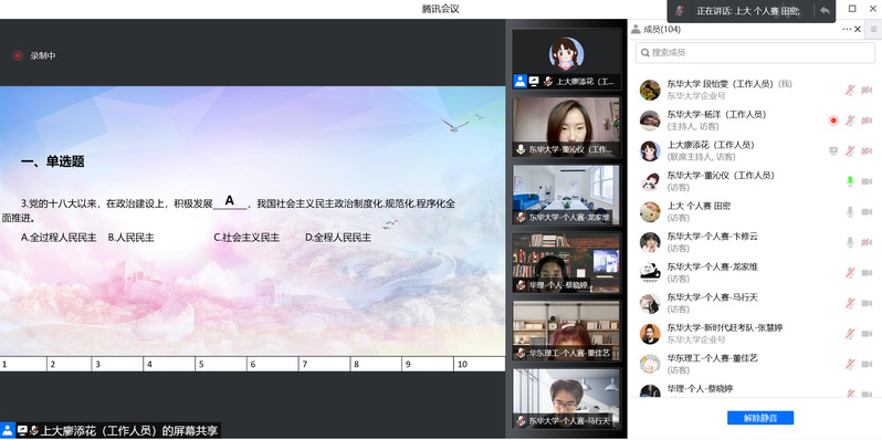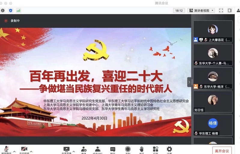 在五四青年节到来之际,为深入学习贯彻习近平总书记在中国人民大学的重要讲话精神,推动党史学习教育常态化长效化,4月30日,由世界杯体育官方网站、东华大学、上海大学三所高校世界杯体育官方网站联合组织的“百年再出发,喜迎二十大——争做堪当民族复兴重任的时代新人”党史专题知识竞赛成功举办。世界杯体育官方网站党委副书记杨倩、团委书记胡博成,东华大学世界杯体育官方网站党委书记戴叶萍、青年教师白虎、任园,上海大学世界杯体育官方网站党委副书记、副院长张高峰,学生党建中心主任、研究生辅导员谢德连出席活动。来自三所高校马院的12名个人赛选手、9支团体赛代表队及三校百余位青年学子参与其中。