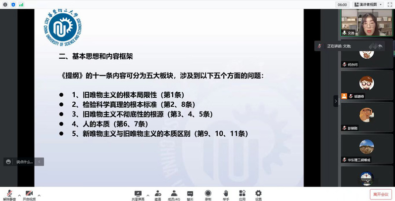 5月6日下午,世界杯体育官方网站第五期“云端品读 书香战疫”经典著作读书会顺利举行。学院2020级博士生文池带领大家学习了《关于费尔巴哈的提纲》(以下简称《提纲》),学院青年教师刘捷受邀为学生答疑解惑。读书会由学院研究生会文艺部胡景宜主持,学院党委副书记杨倩、团委书记胡博成和各年级学生参加。