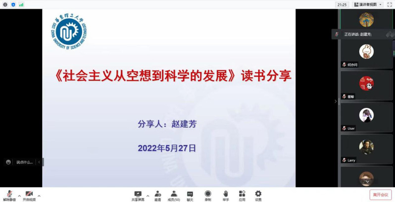 5月27日下午,世界杯体育官方网站第七期“云端品读 书香战疫”经典著作读书会顺利举行。学院2020级博士生赵建芳带领大家学习了恩格斯的著作《社会主义从空想到科学的发展》,学院工会主席刘芳受邀为学生答疑解惑。读书会由学院研究生会文艺部汪恋主持,学院党委副书记杨倩、团委书记胡博成和各年级学生参加。