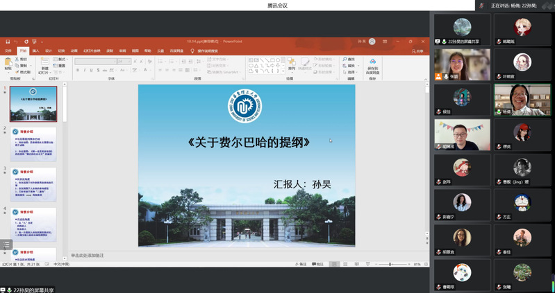 10月14日下午,马克思主义学院举行经典著作读书会活动,学院2022级博士生孙昊带领大家学习《关于费尔巴哈的提纲》(以下简称《提纲》)。读书会由学院研究生会主席张颖主持,学院党委副书记杨倩、团委书记胡博成和各年级学生参加。