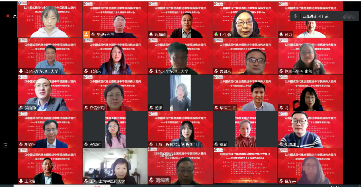 主题研讨环节,上海理工大学世界杯体育官方网站院长金瑶梅、上海中医药大学世界杯体育官方网站院长王芳、上海体育学院世界杯体育官方网站院长胡德平、海南大学世界杯体育官方网站副院长杨娜、世界杯体育官方网站马克思主义学院副院长汪斌锋,分别以“中国式现代化是人与自然和谐共生的现代化的理论探析”“中国式现代化的世界观方法论”“中国式现代化的逻辑起点与实践特点”“构建中国式现代化道路的话语体系” “中华民族发展史视野下的中国式现代化”为主题,作精彩发言。该环节由上海开放大学信息安全与社会管理创新实验室副主任侯劭勋主持。