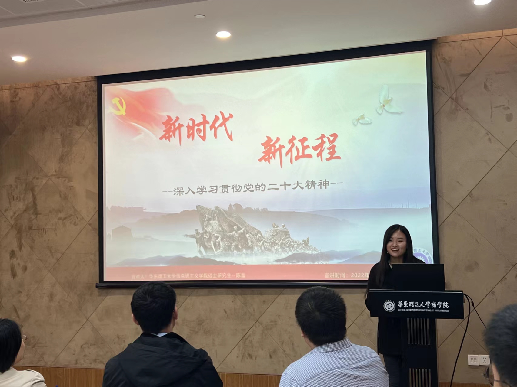 学院博士研究生王曦晨、硕士研究生陈蕾以党课宣讲的形式分享了他们学习党的二十大精神的体会。王晨曦的宣讲主题为“开辟马克思主义中国化时代化新境界”,她用生动的语言和严谨的逻辑,就研究时代重大课题阐释了如何不断推进马克思主义中国化时代化问题。陈蕾从“建设现代化产业体系”这一问题出发,详细介绍了实体经济的概念、地位和发展方向,讲述了新发展格局、现代化产业体系和实体经济的内在逻辑联系。