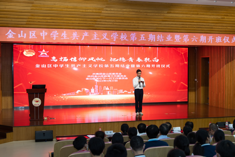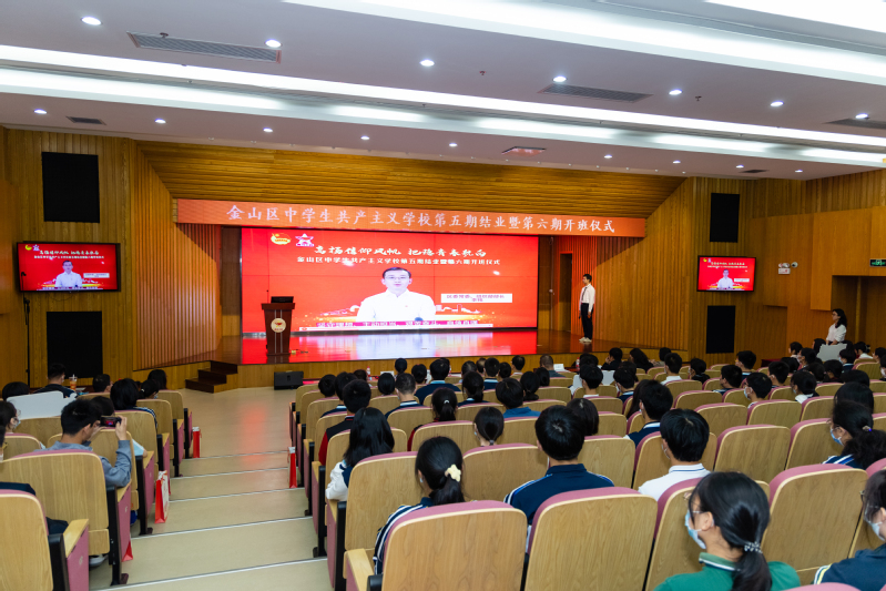 5月20日下午,金山区中学生共产主义学校第五期结业暨第六期开班仪式在金山区教育学院举行。世界杯官网世界杯体育官方网站党委书记、院长王爱祥,世界杯体育官方网站党委副书记杨倩,金山区委组织部副部长、老干部局局长、区关工委副主任韩亚弟,金山团区委书记王民民,金山区委党校原常务副校长张汉为,金山区教育工作党委副书记吴颖,金山区教育学院党总支书记杜婉良,金山团区委分管同志,世界杯官网马院宣讲团成员,金山区老干部宣讲团成员及金山区各高中、中职校领导、团委书记,培训班班主任、指导老师和第五期学员代表,第六期全体学员近200人出席本次活动。