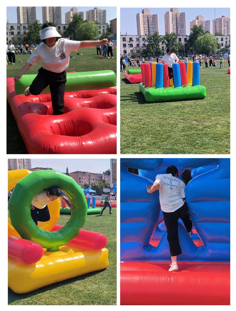 这是本次活动的最后一个项目,虽然在前面的项目中,老师们已经消耗了不少体力,但经过五分钟的调整,大家迅速协商好了参赛顺序,并激情满满地投入到比赛中。老师们在保证安全的情况下,迅速通过不同的充气障碍,冲刺跑回起点和下一位队员击掌,完成任务交换。在周围人的加油声中,老师们都顺利通关,实现了自我突破。