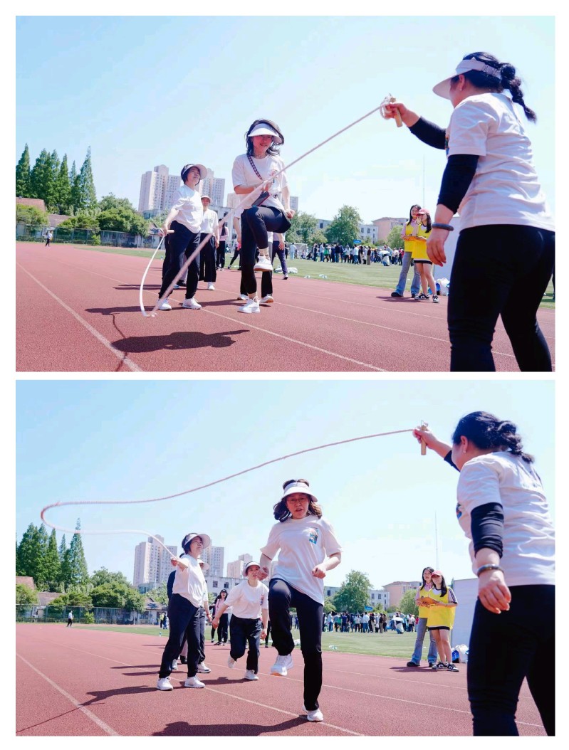 合力跳长绳项目是趣味运动会一直以来的保留项目,需要8位老师按序以8字形行进路线跳绳,不仅考验着每位参与者的协调与默契,更是团队协作的生动展现。随着长绳的甩动,队员们精准把握节奏,快速进出,保持动作一致。