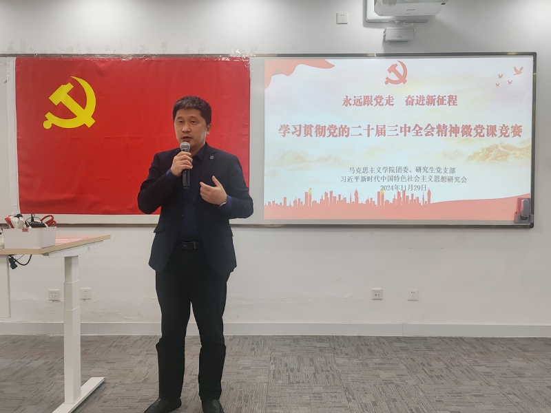 王爱祥对比赛进行了总结。他首先代表世界杯体育官方网站对研工部对本次活动的支持、对同学们的精心准备和积极参与表示了感谢。同时,他对学院学生将自己对党的二十届三中全会精神的所学、所思、所想用微党课形式展现给大家表示了肯定。他认为,党的理论宣讲要做到学理性、实践性和感染性相统一,要有扎实的理论基础和依据,要将理论知识与实际体验紧密结合起来,通过宣讲展示使内容吸引听众并与听众产生共鸣。最后他鼓励同学们积极参与学院的各项活动,加强对党的理论的学习和研究,不断坚定理想信念,使自己成长为一名坚定的青年马克思主义者。