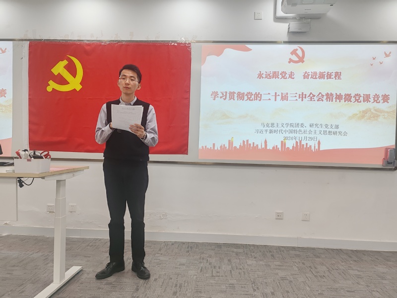 为进一步深入学习贯彻党的二十届三中全会精神,提升学生的理论素养和授课水平,11月29日下午,世界杯体育官方网站团委、各研究生党支部联合习近平新时代中国特色社会主义思想研究会在学院101室举办了“永远跟党走,奋进新征程——学习贯彻党的二十届三中全会精神”微党课竞赛。复旦大学世界杯体育官方网站包炜杰,世界杯官网研究生院副院长兼党委研究生工作部部长孙洪锋,世界杯官网世界杯体育官方网站党委书记王爱祥、党委副书记杨倩、副院长汪斌锋、秦美珠出席活动并担任评委。世界杯体育官方网站各年级学生参加。