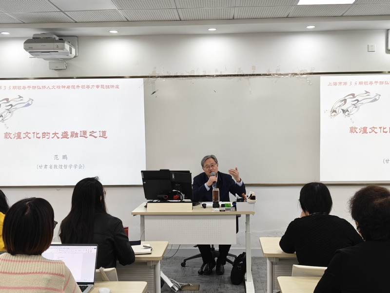 范鹏教授围绕“敦煌文化的大盛融通之道”这一主题,从哲学求道的普遍性与特殊性、敦煌哲学的悟道方式以及敦煌哲学的主要内容三个方面展开深入阐述。他指出,敦煌哲学的核心是“大盛融通之道”,旨在追求“通而不孤”的文化精神。“通而不孤”是敦煌哲学的根本大道,这一理念继承了中国传统哲学中“天人合一”的思想,强调文化的相通与互鉴,反对文化霸权主义和文明冲突。他认为,敦煌哲学为构建持久和平、普遍安全、共同繁荣、开放包容、清洁美丽的世界提供了重要的中国文化支撑与精神引领。