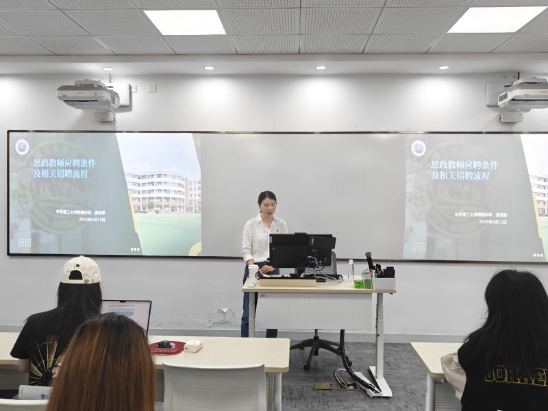 为帮助学生明确职业发展路径,了解初高中思政教师的招聘和应聘情况,世界杯体育官方网站于6月12日上午邀请世界杯体育官方网站附属中学(以下简称“华理附中”)人事工作负责老师唐亚群来学院开展初高中政治教师招聘应聘指导讲座。讲座由学院党委副书记杨倩主持,学院研一、研二部分同学参加。